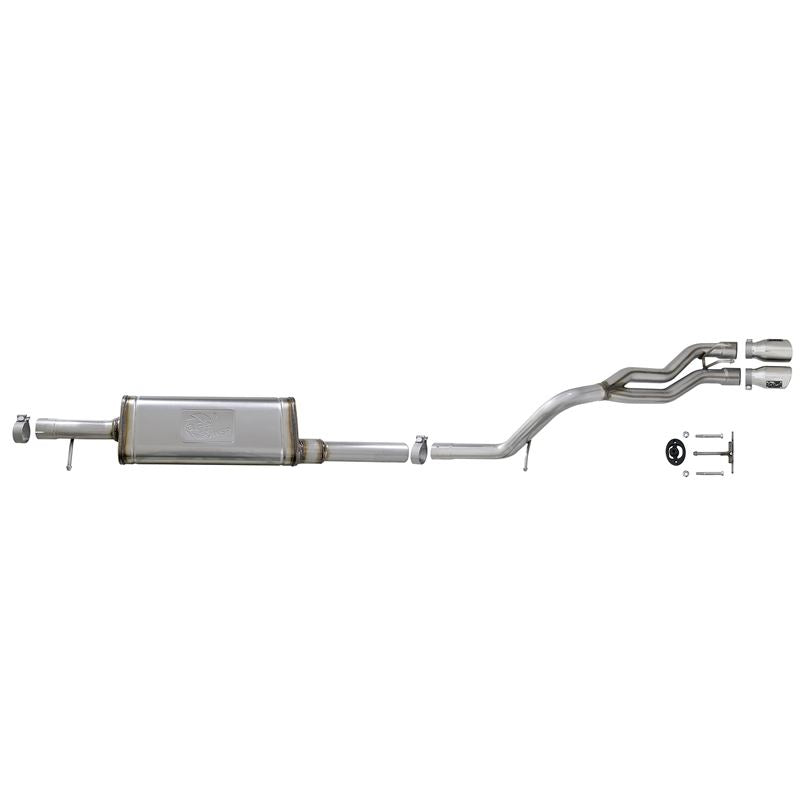 Rebel Series 409 SS Cat-Back Exhaust System with Dual Rear Exit (49-48054-P) by aFe. Exhaust System Type: Cat-Back. Exhaust Tubing Material: 409 SS. Main Tubing Diameter: 2.5". Exhaust System Sound: Moderate. aFe power introduces an all new Rebel Series exhaust system. This Rebel Series cat-back is designed with dual intercooled exhaust tips that exit in front of the rear passenger tire for a unique, aggressive look.