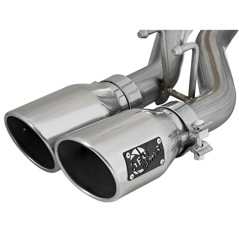 The tips come with unique laser-etched aFe Power logos on the side and are constructed from stainless steel for durability. The exhaust system is constructed from 3" MIG-welded, mandrel bent stainless steel tubing for maximum flow, increased horsepower and torque, outflowing the factory exhaust system by up to 30%.