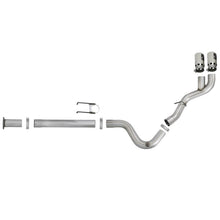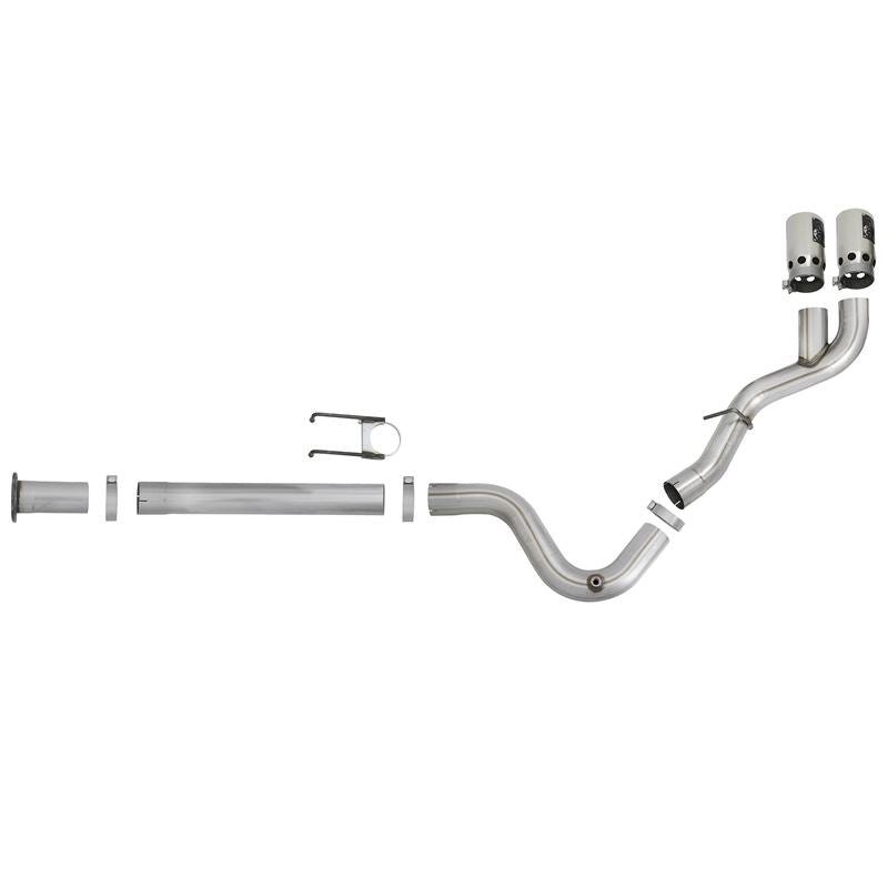 Rebel XD Series 409 SS DPF-Back Exhaust System with Dual Side Exit (49-43102-P) by aFe. Exhaust System Type: DPF-Back. Exhaust Tubing Material: 409 SS. Main Tubing Diameter: 4". Exhaust System Sound: Aggressive / Loud. All systems use factory mounting locations providing stability and hassle-free installation. High quality band clamps are included for a complete 360 degree sealing surface. OE-style bayonet hangers are used to maintain a stable pipe location during high vibration and high heat conditions. The bayonet tip holds the hanger bushing in place for an OE-style fit that does not change with time. This Rebel XD Series exhaust system is constructed of 4" mandrel-bent stainless steel tubing for maximum flow. Smooth transition bends allow for low turbulence, increasing horsepower, torque and lowering EGT's. Finishing off the exhaust are 5" diameter, Hi-Temp black, stainless steel straight cut tips with intercooling vents designed to reduce exhaust gas temperatures at the tailpipe. A unique stainless steel laser-cut aFe Power logo plate is riveted on for an aggressive style.