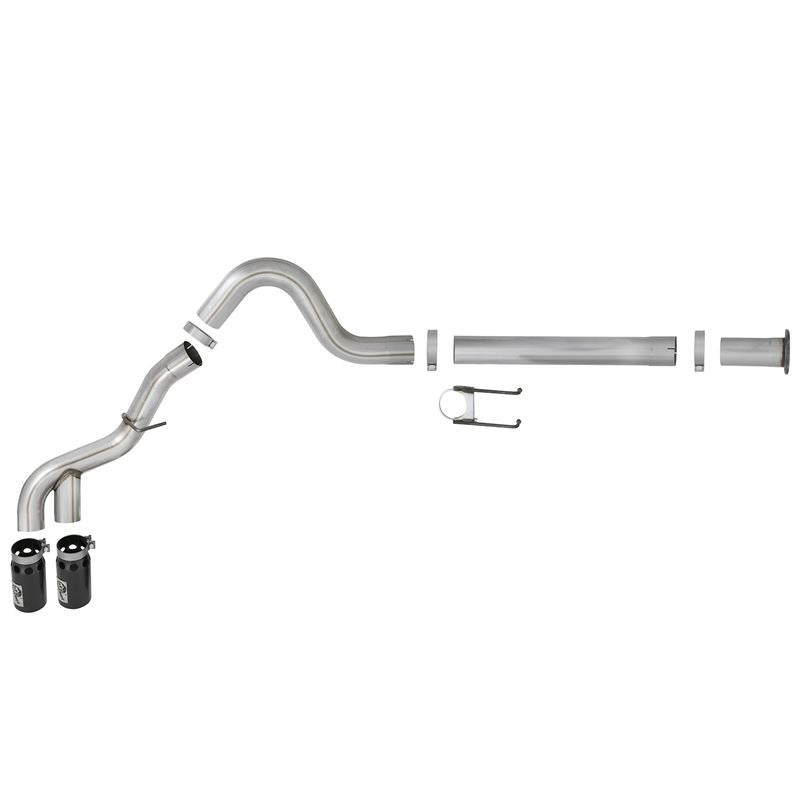 This DPF-back exhaust system is constructed of 4 IN mandrel-bent 409 stainless steel tubing for maximum strength and durability. Finishing off this exhaust system are dual 5 IN diameter black 304 stainless steel intercooled clamp-on exhaust tips. The tips features an aFe POWER logo plate riveted on for a unique style. Some cutting may be required, see instruction sheet for further information. Utilizing a factory style flange and hangers this system mounts directly to factory mounting locations for a hassle-free installation. OE-style bayonet hangers are used to maintain a stable pipe location during high vibration and high heat conditions. The bayonet tip holds the hanger bushing in place for an OE-style fit that does not change with time. 100% MIG-Welded for race-proven strength and durability.