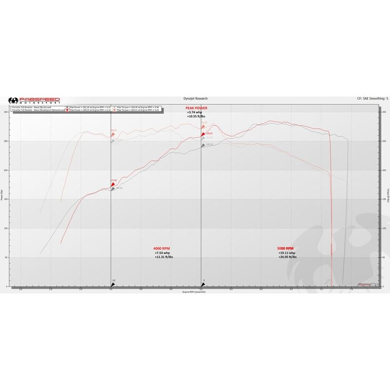 Fabspeed's Maxflo Catback Exhaust added 4 whp and 11 ft-lbs of torque peak power gains when tested on our Dynojet on a stock vehicle. 8 whp and 11 ft-lbs at 3,500 RPM will make a significant difference in drivability. The increased exhaust flow helps tremendously at high RPM, unlocking 19 whp and 20 ft-lbs of torque at 5,000 RPM. To extract more power, we recommend pairing this system with our Porsche 718 XperTune handheld tuner