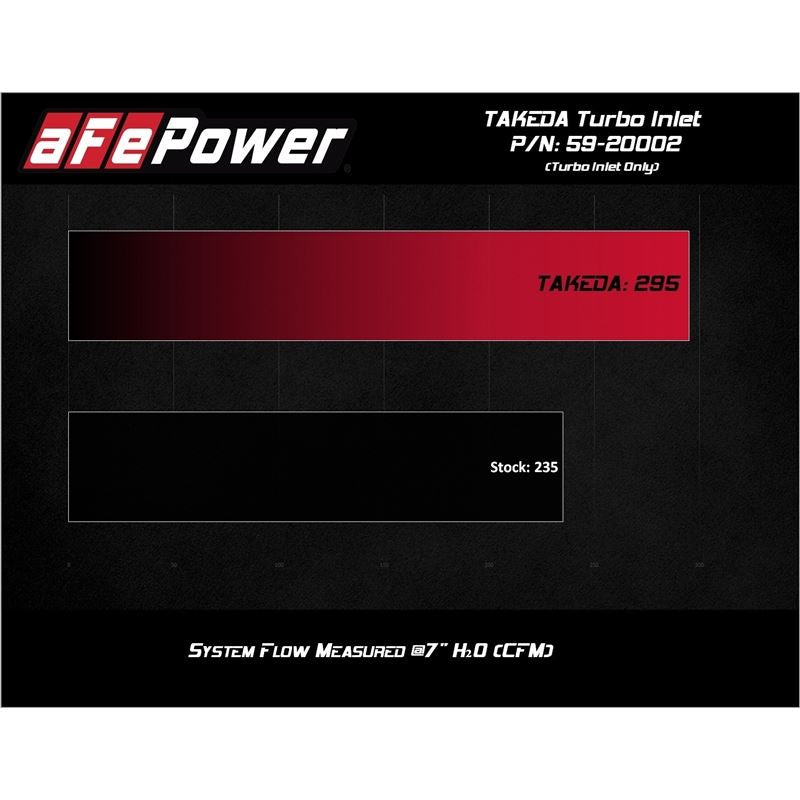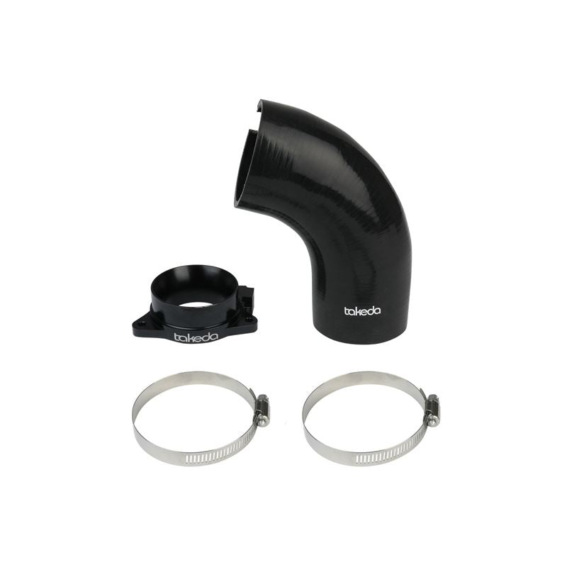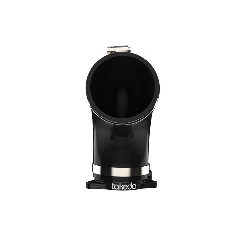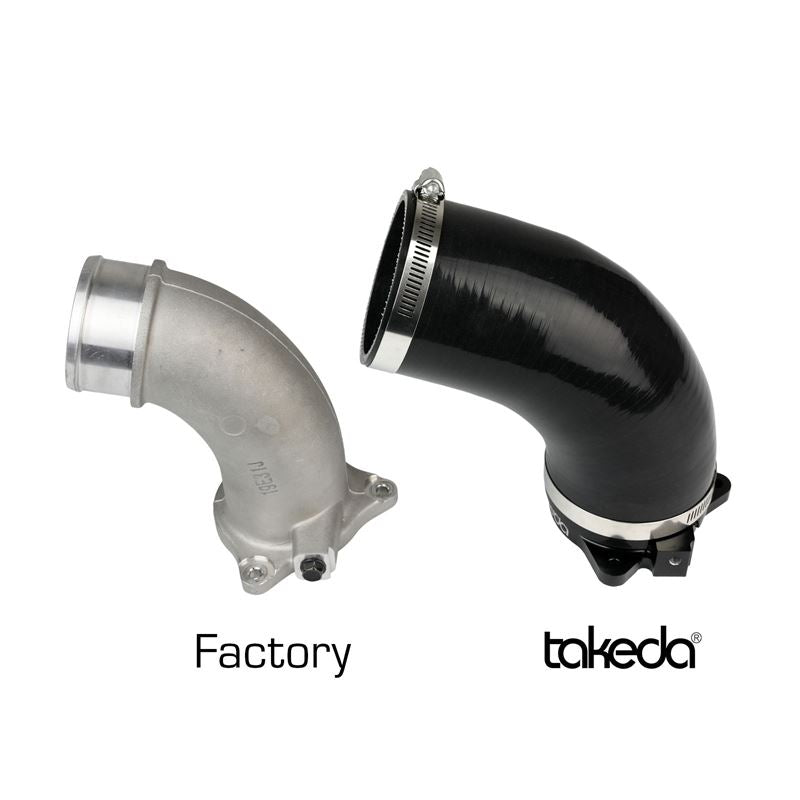 This turbo inlet is the perfect addition to the Takeda intake. It removes the air flow restriction of the factory turbo inlet and guarantees the maximum air flow to the turbo for maximum power. It provides a smooth transition for the air from the Takeda air intake tube to the turbo with the minimum restriction. Precisely CNC machined out of 6061-T6 billet aluminum, the adapter mounts directly onto the turbo and guides the increased air flow from the Takeda intake into the turbo. It is black anodized for durability and a stealthy appearance. This turbo inlet utilizes a flexible silicone coupling that is reinforced with three layers of polyester material, making it resistant to wear and deterioration. The silicone coupling mates directly to the aluminum turbo adapter and the Takeda air intake tube. All necessary clamps are provided. All necessary clamps and hardware are provided for a fast and easy installation. The factory harness bracket mounts directly onto the aluminum adapter for perfect fitment. This item will only fit with Takeda air intake systems P/N: 56-10021D , 56-10021R, 56-70021D and 56-70021R . It will NOT fit with the factory air intake system. For use with factory air intake system, see part number 59-20001.
