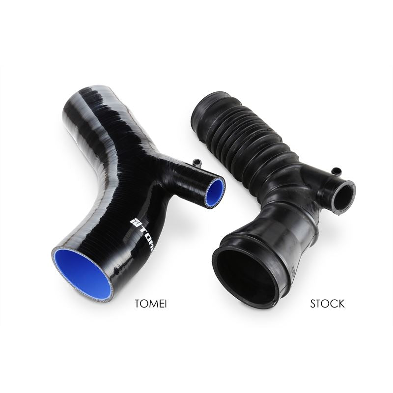 The enlarged turbo suction hose and enlarged turbo inlet elbow features a combined capacity of 135% vs the stock setup! Together with the smoother bends, this allows for a dramatic improvement in air flow efficiency to the turbo resulting in a significant performance increase. Eliminating the accordion-style design found on the stock unit greatly reduces the build up of turbulence for a smoother, more efficient flow of air to the turbo. In addition, the various connecting tubes have also been streamlined to further improve the hose's flow efficiency. Each kit includes a blind plug to use in place of the boost solenoid return nipple when using devices such as an aftermarket boost controller/solenoid. The hoses are made using heat resistant, highly durable, fiber reinforced 4 ply silicon, infused with steel wires for maximum durability. Not only does this prevent the hose from collapsing/flexing under load, it also improves it's longevity as well, allowing it to sustain a high level of performance over time.