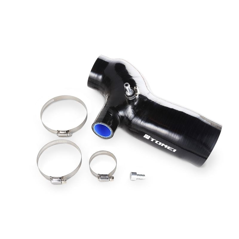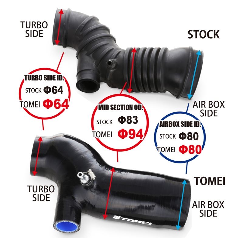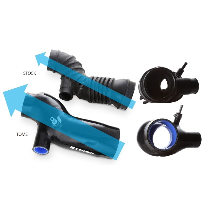 The enlarged turbo suction hose and enlarged turbo inlet elbow features a combined capacity of 135% vs the stock setup! Together with the smoother bends, this allows for a dramatic improvement in air flow efficiency to the turbo resulting in a significant performance increase. Eliminating the accordion-style design found on the stock unit greatly reduces the build up of turbulence for a smoother, more efficient flow of air to the turbo. In addition, the various connecting tubes have also been streamlined to further improve the hose's flow efficiency. Each kit includes a blind plug to use in place of the boost solenoid return nipple when using devices such as an aftermarket boost controller/solenoid. The hoses are made using heat resistant, highly durable, fiber reinforced 4 ply silicon, infused with steel wires for maximum durability. Not only does this prevent the hose from collapsing/flexing under load, it also improves it's longevity as well, allowing it to sustain a high level of performance over time.
