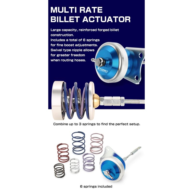 This hybrid turbocharger idea is exactly what Tomei is doing with their new MX-Series of turbochargers. If you want excellent drivability but also want more power than the stock turbocharger can offer, a hybrid turbocharger may be the perfect solution for you. With a CNC Billet Compressor wheel, Tomei MX-Series turbochargers offer a significant improvement over traditional cast compressor wheels.They are machined from aerospace grade materials, and are highly durable and lightweight. They are feature a thinner blade with a larger surafce area to maximize airflow and turbo spool. The multi rate billet actuator of the MX-Series turbos are large capacity and are made from reinforced forged billect contructions. They include 6 springs for fine boost adjustments and a swivel type nipple to allow for greater freedom when routing hoses.