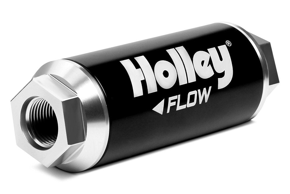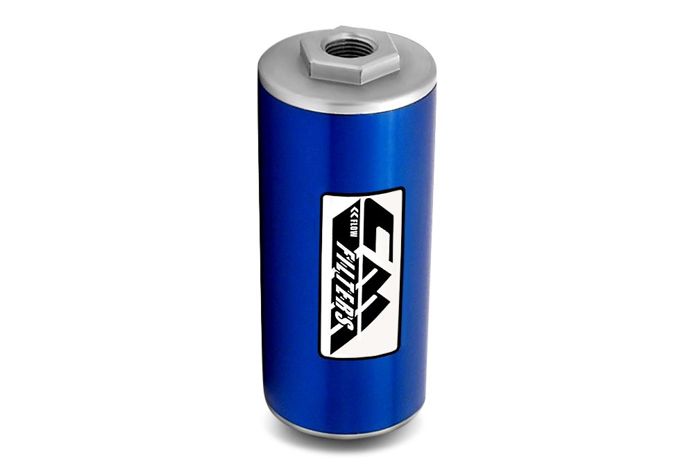 Performance fuel filters are commonly rated in microns - the smaller the micron number the finer the filtration - and some are also rated for flow, usually in Gallons Per Hour (GPH). Many performance fuel systems are configured for an external fuel pump, in which case a higher micron number filter, 100 for example, would be used between the tank and pump to protect the pump. A finer 40 or 10 micron filter would be installed after the pump to protect the carburetor or injectors respectively. We offer both in-line filters, with and without replaceable filter elements, and canister filters. These filters come in a wide range of sizes and with adapters can be connected to most common AN fitting and line sizes.