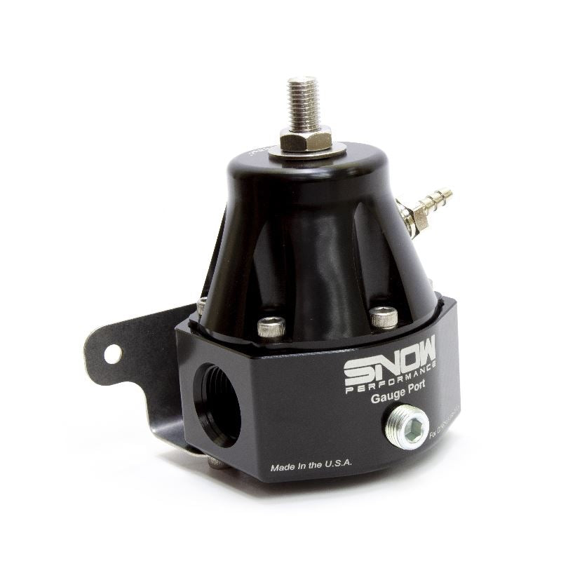 If you're looking for an offshore piece of junk regulator, this product is not for you! If you're looking for the best performing regulator on the market that is designed and built in the USA from the highest quality components available, this is your regulator. Snow Performance's High Flow Billet Fuel Pressure Regulator sets itself apart from the competition with anodized billet aluminum internal components, a Fluorosilicone coated Nomex diaphragm, and a silicon nitride ceramic ball which will never corrode, making this regulator safe for any type of fuel. Combine all these features with a corrosion-resistant spring, and a black anodized CNC machined aluminum body, your result is a fuel pressure regulator that responds lightning fast to your vehicle's ever-changing fuel flow demands and is compatible with any type of fuel, INCLUDING E-85 and METHANOL!,, Features:,, Made in the USA, Adjustable from 35-100psi, Two 8AN ORB inlet/outlet ports, 8AN ORB Return Port, 1/8 hose barb for 1:1 vacuum/boost reference, 1/8 NPT gauge port
