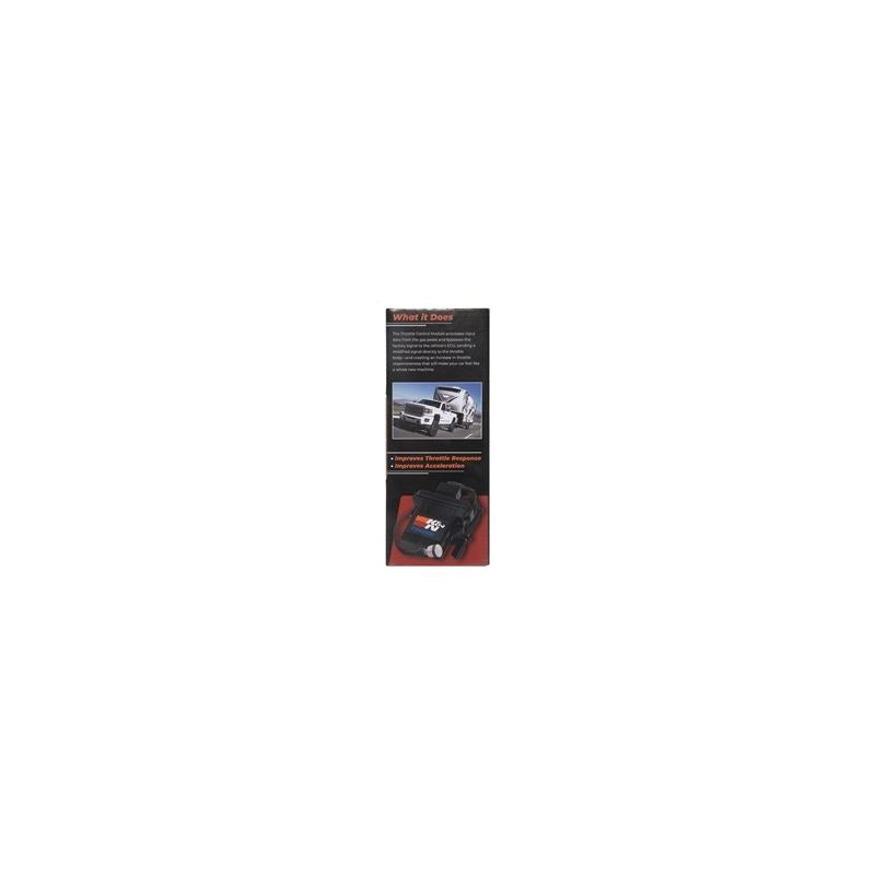 The K&N Throttle Control Module is designed to improve throttle response and acceleration, and increases pedal sensitivity without modifying factory ECU settings. The system processes input data from the gas pedal, and modifies the signal before sending it to the ECU for an adjustable level of sensitivity, creating an increase in throttle responsiveness that will make your car feel like a whole new machine. The Throttle Control Module can typically be installed in less than 30 minutes with no software required, and is adjustable on-the-go, helping you fine-tune the sensitivity of your throttle response. The kit includes the module, wiring harness, adjustable knob, hardware, and detailed instructions, and is covered under K&N's 90-Day Limited Warranty. How It Works -The Throttle Control Module processes input data from the gas pedal, and modifies the signal before sending it to the ECU for an adjustable level of sensitivity, creating an increase in throttle responsiveness. Wire harness -The wire harness connects the Throttle Control Module's electronic control unit to the throttle pedal on the vehicle, allowing a direct connection between your gas pedal and throttle body. The plugs and connectors are designed to attach directly to your vehicle's stock components for easy plug-and-play installation. Control dial -The stylish aluminum control dial installs into the cab of your vehicle to give you direct control over your Throttle Control Module, allowing you to adjust how much or how little the throttle signal is adjusted. Not legal for sale or use on any pollution controlled motor vehicle in California.