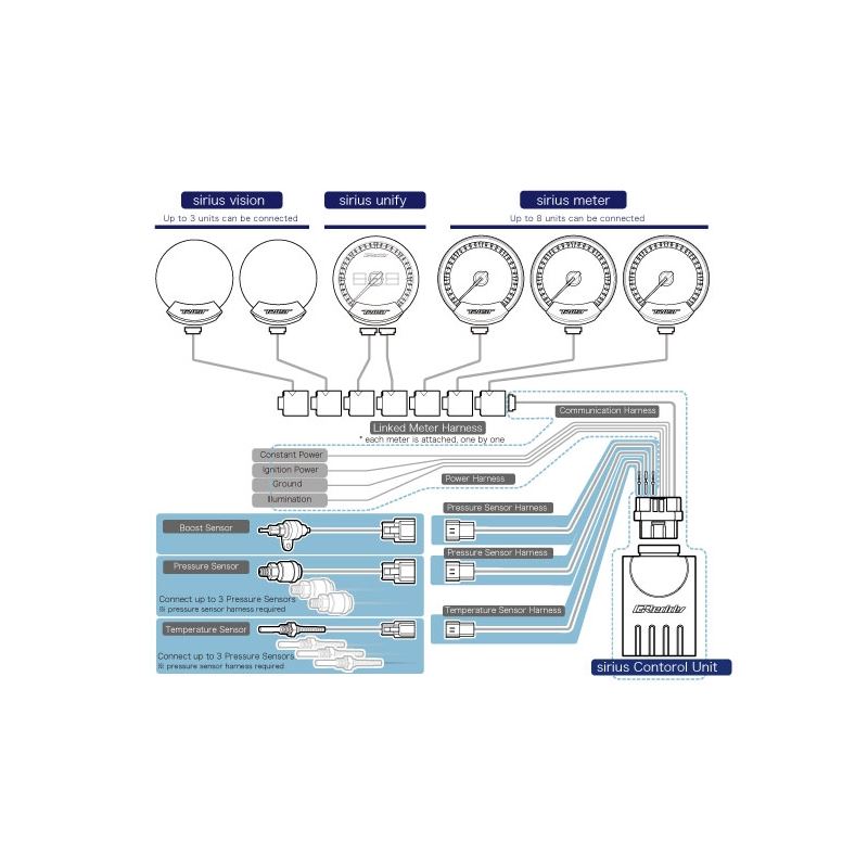 Sirius Vision is designed around our advanced thin-film electro luminescent display. The unique clear screen with intense lighting allows the unit to be used as a heads up display or to be combined with a Sirius Meter to overlay additional information. With the use of this plug and play Sirius (OBD II) ISO CAN communication set (Compatible models only.) It is now possible to connect your vehicles ECU readings to the Sirius Control Unit, to display sensor readings like: boost, water temperature, intake air temperature, RPM, vehicle speed, and/or voltage patterns on the included clear Sirius Vision