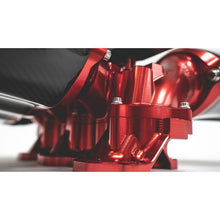 Proper function of the plenum is extremely important to the performance of any intake manifold. In the case of the GT-R, there are two plenums – one for each bank. Not only should they be sized for correct volume, they provide even more benefits when shaped in such a way that distributes charged air more evenly amongst each of the precisely machined CNC aluminum velocity stacks leading into the runners. Both lightweight carbon fiber plenums are molded and tapered to channel charged air effectively – reducing turbulence and accelerating the delivery of charged air to the engine. By maintaining balance and sustaining maximum airflow velocity and pressure when needed, your GT-R benefits by outputting more horsepower!