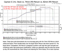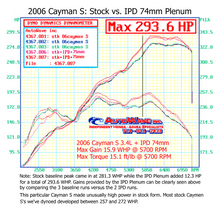 The 74mm Cayman S Plenum application is recommended for Cayman enthusiasts looking for considerable performance gains without pushing the performance envelope. Max horsepower is 14 and max torque is 12 which all comes in around 5600 RPM. Power gains are realized throughout the entire power band without any loses in power.