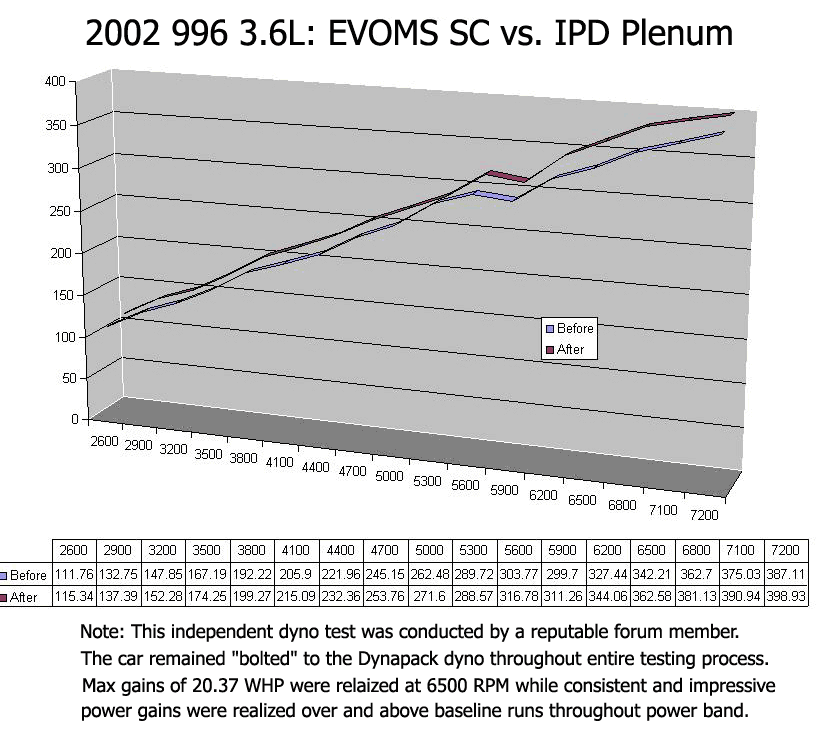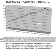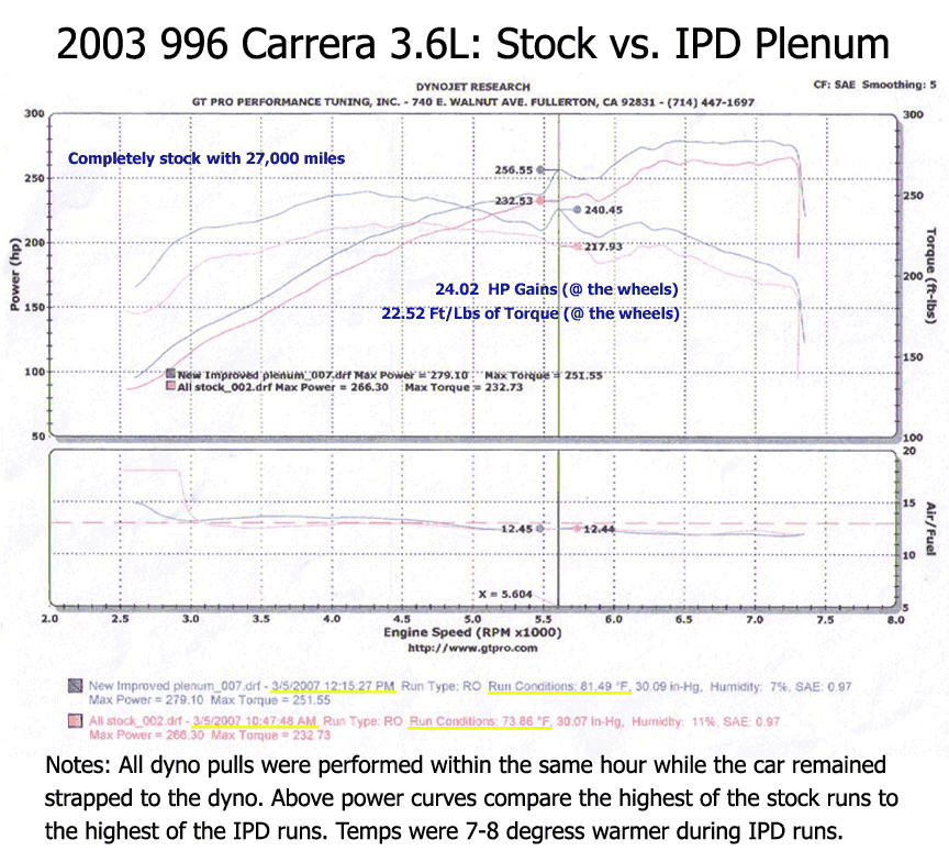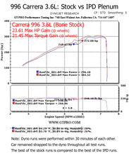 The IPD Plenum delivers impressive horsepower gains of 24 and torque gains of 22 by means of a superior and more efficient design. These gains are mainly felt in the mid range where it is most needed and most enjoyed but performance improvements are realized throughout the entire rev range. Performance improvements like this can be felt in the "seat of your pants" and will truly transform your Porsche driving experience.