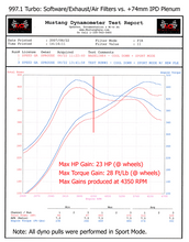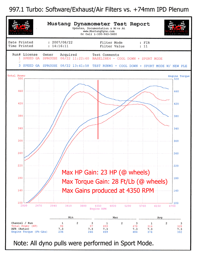The patented IPD Plenum design works exceptionally well with all forced induction applications and the 997 Turbo is no exception. Power and torque increases provided by the IPD plenum are impressive and stay over and above all factory power curves from launch to redline. Maximum power increases take place in the midrange where it's most needed and most critical.
