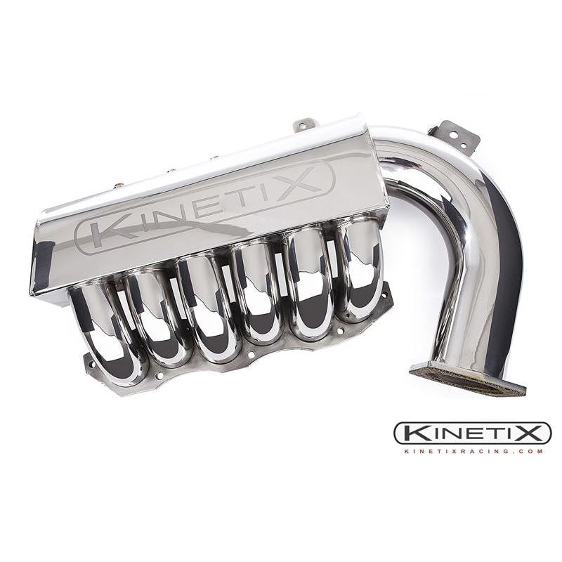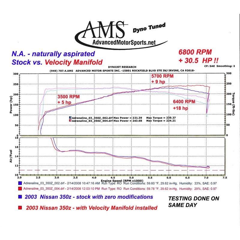 ** Newly released Velocity Intake Manifold replaces our older SSV version with many improvements: * Velocity plenum chamber design - Equal air flow between cylinders * 12% more plenum chamber volume * 10% short intake runners for more flow and higher HP potential * Smoother A/F curve - less tuning required - more consistent power * High RPM power !! 30.5hp gains at 6800 rpm * Thicker gauge construction for higher boost - warranty up to 30psi * Ready to install - Includes all necessary hardware and gaskets for installation Fits the following models: 2003-2007 350z 2003-2007 G35 (single throttle body engine models) 2003-2008 FX35 We took the very popular SSV manifold and went over every aspect of its design to make the most impactful improvements. As our customers and the 350z/g35 marketplace continue to improve the power potential of their engines, the SSV needed a redesign to accommodate the the higher power output of these vehicles. The new Velocity Manifold is geared for higher flow and higher RPM power gains. This allows for even larger power gains in the many F/I vehicles out there. The new Velocity Plenum design maximizes flow to the furthest cylinders by creating a "venturi" effect. By gradually narrowing the plenum chamber, the air speed must increase to satisfy the equation of continuity. Improved flow to all cylinders also means an improved smoother A/F curve that requires less tuning in F/I applications, and near ZERO tuning in N/A vehicles. This manifold is constructed entirely of Stainless Steel, then polished out for an absolute beautiful finished product that looks as great as it performs. We chose stainless because of its great thermal properties, conducting 10X!! less heat than aluminum and eliminating much of the manifold's mass, which greatly helps with heat soak. Stainless is considerably more expensive than aluminum, but the finish shines brighter and longer. The overall manifold SAVES 10lbs of weight over stock! Precision TIG welding throughout, and a CNC cut 3/8" main flange. All mandrel bent runners and charge tube, this manifold rivals the quality of other intakes twice its price. We improved greatly upon the factory plenum designs. The factory lower plenum has many dips and turns which do not promote good airflow and creates turbulence inside your factory intake. We developed a straight shot design, eliminating the twists, turns, and obstructions. We then took each runner and also added velocity stack inlets to each individual runner for even better performance. This Manifold is a DIRECT replacement and will work with any aftermarket intake. It also allows you the ability to use the factory strut bar, or any aftermarket strut bar. We also have available an engine cover specifically designed for our manifold. We recommend an A/F tuning on Forced Induction vehicles (turbo and supercharged) after installation of the Velocity Manifold in order to maximize power and overall engine reliability. Tuning is generally not needed in Naturally Aspirated (N/A) applications. Each manifold is supplied with all necessary hardware and instructions. There is an additional port supplied which can be used for boost gauges, etc. * Due to State Emissions Regulations, in California this product is only intended for off-road use.