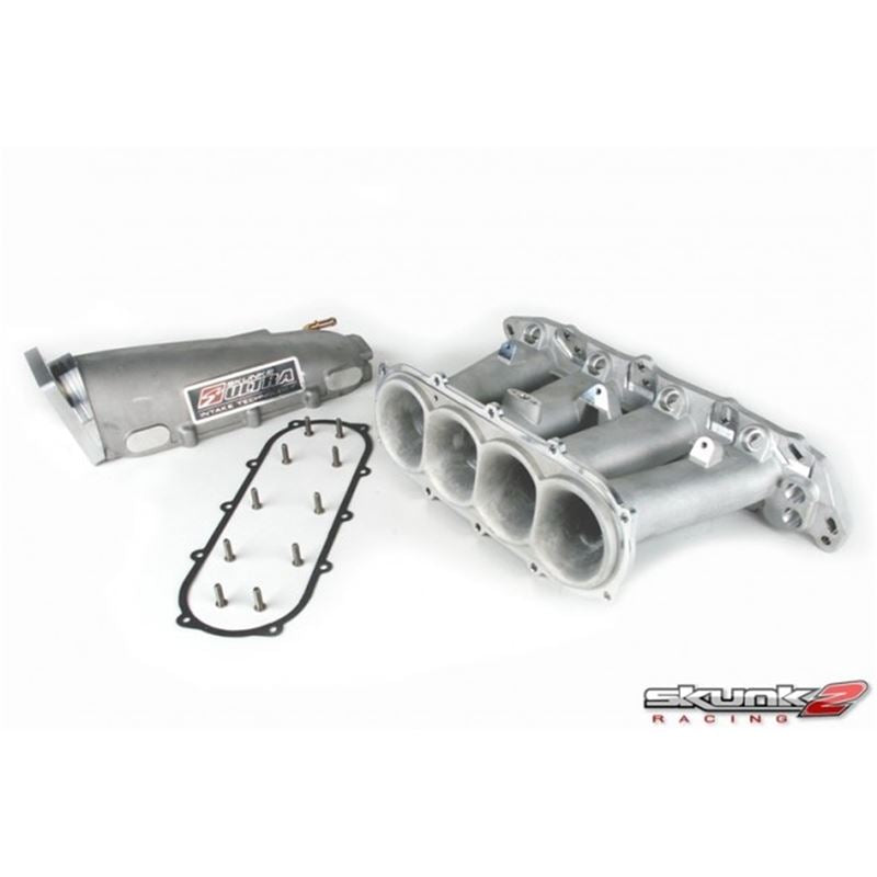 Silver Manifold-Dual Flange Bolt Pattern-1.82L Volume-8.72in. Long Runners-74mm Inlet w/B Series T/Body Bolt Pattern-2pc. Design. The engineers at Skunk2 Racing have worked tirelessly to develop the next generation of high performance intake manifolds and are proud to announce the release of the much anticipated Ultra Series Intake Manifold. Years of R&D have culminated in a multi-piece cast aluminum intake manifold that offers advantages that only a modular design could allow. Building upon the performance legacy of our Pro Series Intake Manifold, as well as using the latest in CFD (Computational Fluid Dynamics) software; Skunk2 Racing has created a three-piece modular design that allows for easy disassembly, porting, and plenum volume changes through the use of a removable plenum and optional plenum spacers. In addition to CFD testing, the Ultra Series Intake Manifold has undergone extensive in-house dyno and on-car testing which has led to a design that is less restrictive, yielding both torque and power gains well over many of the competitors. Detailed and meticulous planning went into every aspect of the Ultra Series Street Intake Manifold. Ultra Series Street Intake Manifolds are manufactured from cast-aluminum high-grade 356 aluminum alloy for lightweight yet added strength over sheet metal manifolds. Each manifold is CNC-machined for a precise fit, and individually inspected for quality assurance. The Ultra Series Street manifold features a generous 74mm throttle body opening and is constructed with thick walls and entry minimizing concerns of breakthrough when port matching. Intense planning and design went into the plenum (1.82L plenum volume) to distribute even airflow to all four cylinders under dynamic load conditions. Placement and design of the velocity stacks were rigorously flow tested to ensure maximum delivery of air to the cylinder. Large velocity stack raised bell mouth entries lead to long 221.5mm intake runners with smooth transitions allowing the Ultra Series Street Intake Manifold to outflow the competition.