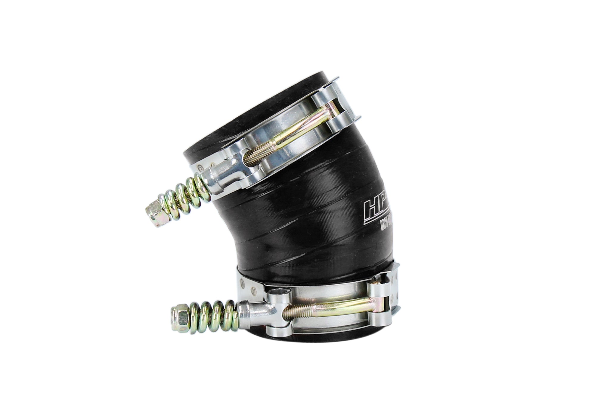 This HPS High Temp 4-ply Reinforced Silicone Turbocharger Intercooler Boot is an upgraded replacement for an OEM turbocharger intercooler boot, which is known to weaken and fail over time. Crafted with oil-resistant fluorolined silicone and engineered for superior performance, it is capable of enduring high levels of boost pressure and extremely high temperatures (up to 500F) under the hood, ensuring reliability across various operating conditions. With 4 layers of aramid reinforced silicone and a pressure tolerance of over 100 PSI, boost leaks are a thing of the past. Designed using the OEM component, this HPS product guarantees a seamless fit. Included in this kit are stainless steel spring loaded T-bolt clamps for an easy and leak-free installation. Upgrade your truck or equipment with this boot kit and avoid costly expenses in the long run.