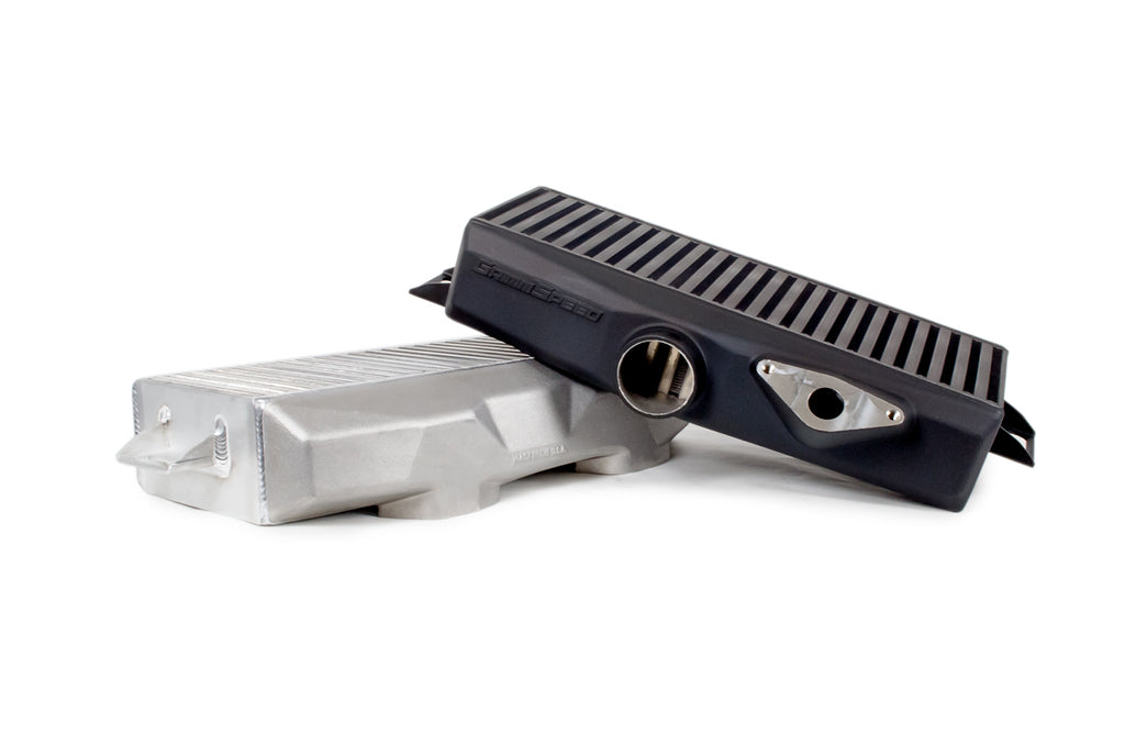 In our pursuit of perfection (theres that p-word again), we learned a great deal about aluminum casting. If youve done similar research, you know that every aftermarket end tank that youve handled was cast from a one-time-use mold made of re-used sand. Not our style. In typical GrimmSpeed fashion, we stepped outside of the box and explored other options. We quickly learned that we had stepped into big boy territory. Ill let the photos do most of the talking, but heres the scoop. To achieve the quality, tight tolerances, pressure tightness and strength that we required, permanent mold casting became our only option. Each and every end tank is cast from the same CNC machined mold, ensuring not just dimensionally-perfect castings with an amazing surface finish, but also excellent repeatability. With this method, we have perfect control over both the internal and external contours of each casting. After casting, every single mating surface is precision machined for a leak-free finish and unbeatable fitment. We will not be outdone.