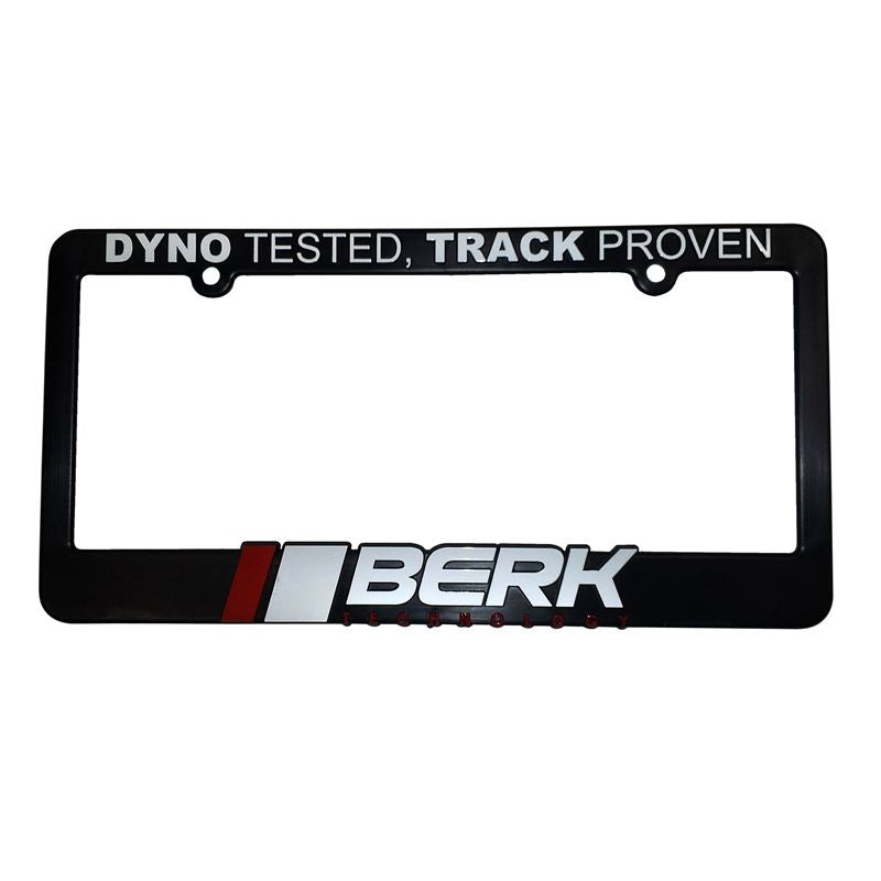 Berk Technology License Plate Frame Black with White Dyno Tested, Track Proven and Berk logo, Technology in Red, USA plates