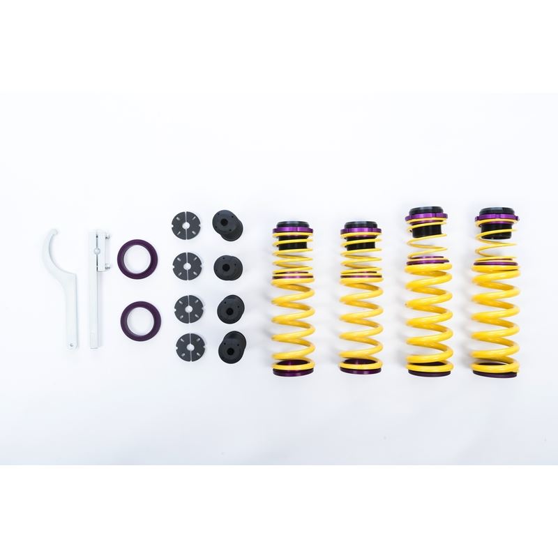 KW height adjustable spring kits are a great alternative to conventional lowering springs. You now longer have to be satisfied with a fixed lowering height. KW HAS systems allow you to adjust the vehicle ride height with the KW height adjuster even after the kit has been installed. Your vehicle does not only get a more dynamic look with the KW height adjustable spring kit, but also the steering behavior and response of the standard dampers becomes more agile. All driver assistance systems and comfort features of a factory adaptive or electronic suspension remain operational and work harmoniously with our vehicle specific spring set up.