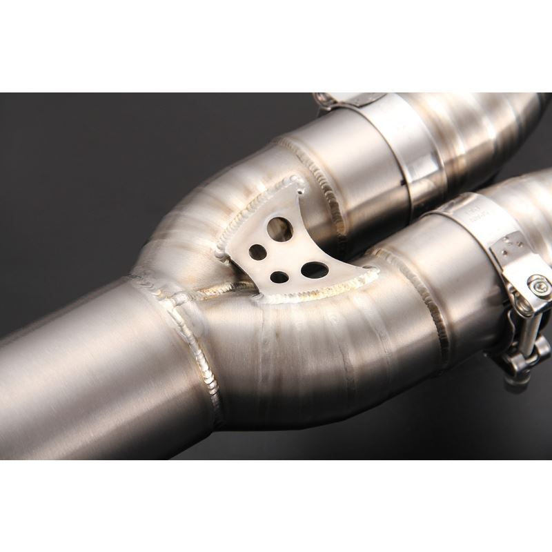 Compared with the stock design, our design is single piping all the way for max weight reduction. We have also focused on the design of the muffler to produce the best exhaust sound without compromising performance. The pipe diameter was chosen for optimum exhaust flow efficiency. For performance use in mind and weigh reduction. Thus the slide joints was made instead of using the conventional flange and gasket design.