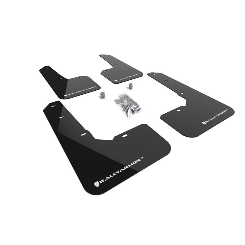 UR Series Black Mud Flap Kit with White Rally Armor Logo (MF76-UR-BLK/WH) by Rally Armor, 2 Pairs. Location: Front and Rear. Rally Armor UR ("you are") mud flap application is fabricated from premium urethane. You can experience the outstanding protection against rain, snow, mud, dirt and road debris of Rally Armor UR rally mud flaps. These urethane mud flaps are consistently flexible despite varying temperature and road conditions. Rally Armor polyurethane rally flaps endure the elements season after season while finishing the vehicle with a rally look.