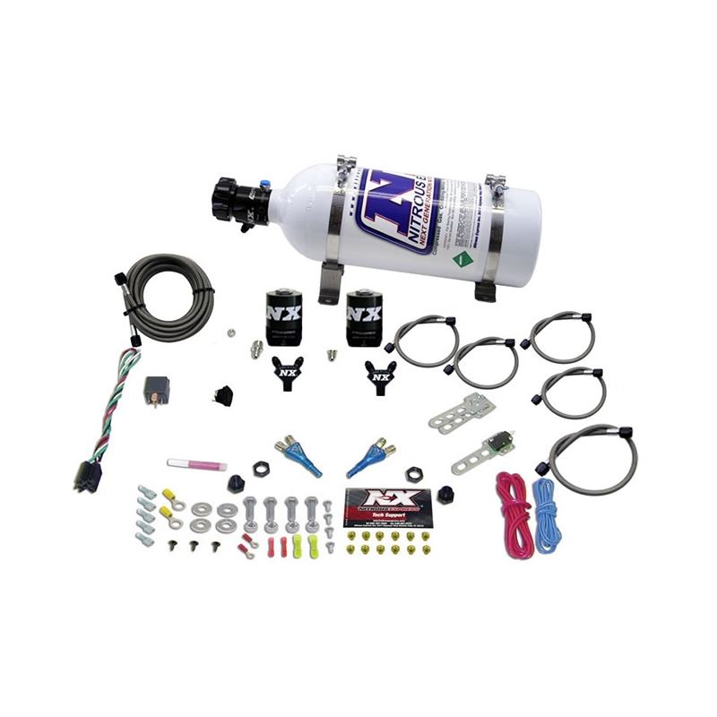 NX dual nozzle nitrous systems are a great choice for vehicles with dual throttle bodies. The dual Shark nozzles give adjustability of 35, 50 & 75 wheel horsepower. System comes complete with 5lb nitrous bottle, stainless bottle bracket, Lightning solenoids, extra long stainless braided N2O line, and all necessary hardware to complete the installation