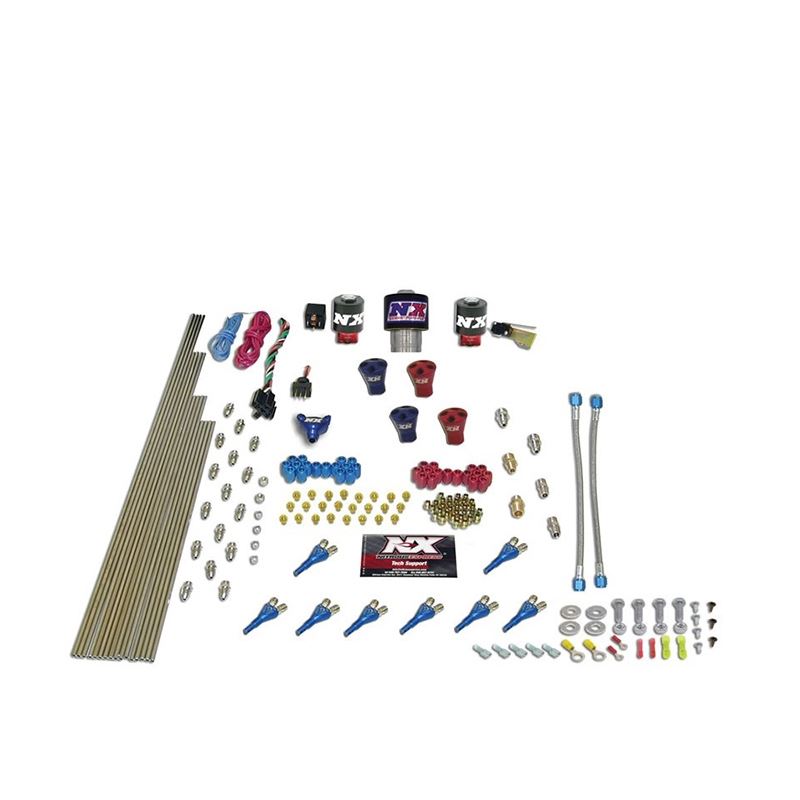 This NX dual stage direct port system provides the ultimate in cylinder to cylinder distribution. This system utilizes the patented NX Shark nozzles! Nitrous system comes complete with 2 Super Shark nitrous solenoids, 4 aluminum / carbon fiber Lightning fuel solenoids, stainless bottle brackets, stainless hard lines, 16 nozzles, jetting, and all necessary electrical components. This system requires the drilling and tapping of intake manifold. Includes nitrous / fuel Rails instead of distribution blocks.