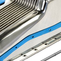 Much of the information above applies only to wet sump oil pans. We also offer pans for dry sump systems, where the pan is actually a shallow sump, from which oil is scavenged by an external pump and stored in a remote reservoir. Dry sump systems have long been used in racing and are starting to show up in some production performance models. They have a number of advantages: The rotating assembly is free of oil drag, allowing the engine to make more power; crankcase vacuum created by scavenging improves ring seal; the remote tank allows an easy increase in oil capacity; and the shallow pan provides more ground clearance.