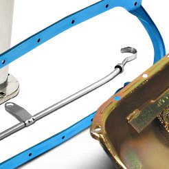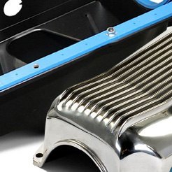 Much of the information above applies only to wet sump oil pans. We also offer pans for dry sump systems, where the pan is actually a shallow sump, from which oil is scavenged by an external pump and stored in a remote reservoir. Dry sump systems have long been used in racing and are starting to show up in some production performance models. They have a number of advantages: The rotating assembly is free of oil drag, allowing the engine to make more power; crankcase vacuum created by scavenging improves ring seal; the remote tank allows an easy increase in oil capacity; and the shallow pan provides more ground clearance.