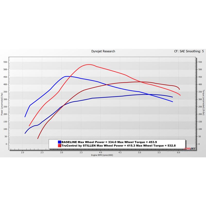 In terms of torque increases, our TruControl truly excels. The stock dyno indicated a maximum torque of 453.9 ft lbs. Yet, with the TruControl by STILLEN Inline Power Module in place, our test truck showcased a remarkable increase, delivering 532 ft. lbs of torque*. The most significant surge over stock figures occurred towards the mid range, with an additional 79 ft lbs recorded at the wheels!