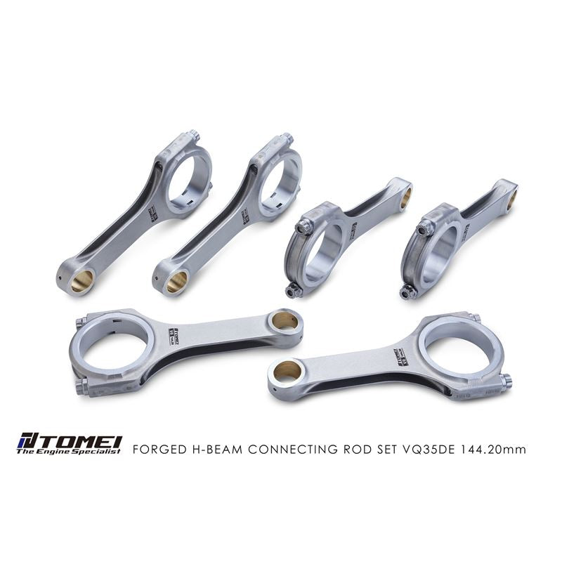 Tomei Connecting Rods are forged from molds with the main bearing hole predetermined, not machined from a solid piece. This produces a connecting rod with supreme durability which can withstand extreme conditions. Lack of the large end's strength leads the metal to distort and the bearing to wear out. To secure enough strength, Tomei applies "round shoulder shape" at the link of the rod's large end. To provide lubrication to the bushing in small end, instead of sending oil through the long hole inside the rod from the large end, Tomei assembled a tapered oil hole at the top of the small end so that the oil will drip during the piston's compressing cycle. This way the strength of the rod won't be sacrificed.