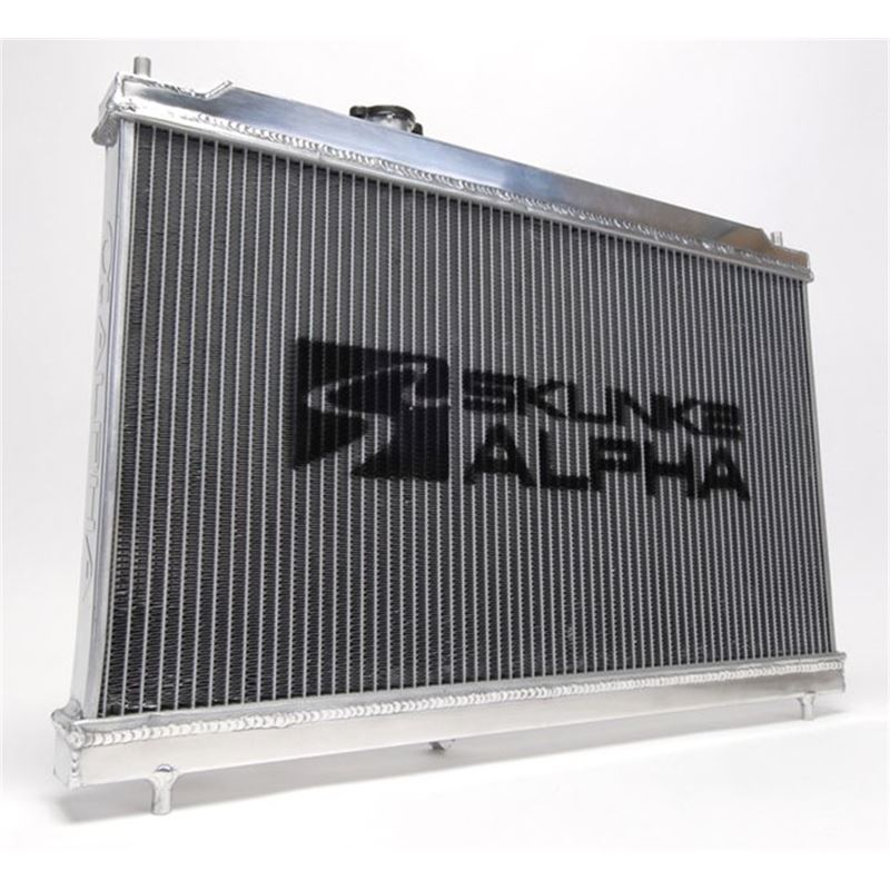 All Aluminum High Performance Dual Core Radiator-Manual Trans Only-1.25in. Inlet/Outlet-Dual Core Design-Includes 1.1Bar Skunk2 Radiator Cap. Skunk2's all-aluminum, full-size Alpha Series Radiator for the '94-'01 Integra is a direct-fit upgrade designed to dramatically increase both cooling efficiency and engine performance. Alpha Series Radiators are manufactured from lightweight and durable aluminum, feature 100-percent brazed cores, and include polished end tanks with Skunk2's signature Alpha logo embossed along each side. Each Alpha Series Radiator features a dual-core design, high-efficiency fins for maximum cooling capabilities, and includes a genuine Skunk2 Radiator Cap for maximum performance and a premium appearance. Each Alpha Series Radiator also includes provisions for the OEM cooling fan and OEM-compatible, 1.25-inch inlets and outlets. Skunk2's commitment to producing high-quality components means that each Alpha Series Radiator meets or exceeds original equipment manufacturer standards, that each radiator may be installed without modification to the vehicle, and is compatible with OEM hoses, cooling fans, and shrouds. (Note: Some engine swap applications may require custom radiator hoses and/or cooling fans.) Skunk2's Alpha Series Radiators are the perfect addition to any high-performance vehicle and are designed for the street, the track, or even OEM replacement purposes. Alpha Series Radiators are built to withstand harsh elements as well as against years of under-hood heat cycling. Each Alpha Series Radiator adheres to strict quality control standards and careful packaging, resulting in tubes and fins capable of optimal flow and efficient heat transfer.