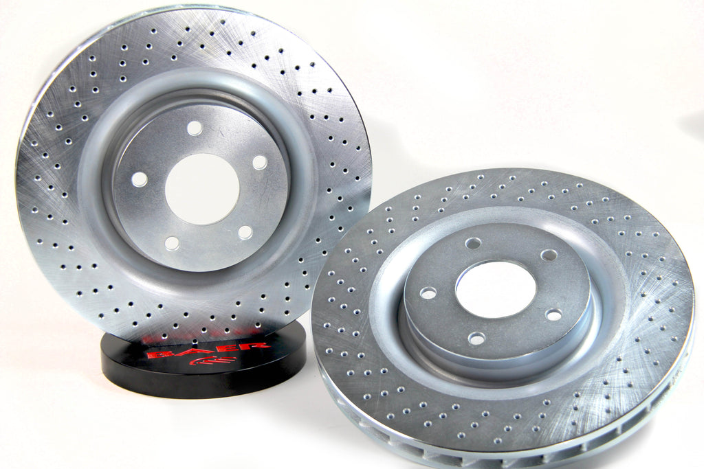 Baer Claw performance rotors are a great way to improve your vehicles braking performance and overall appearance. The kit includes a pair of direct replacement rotors with a cross-drilled friction surface that allows an escape route for the gasses and dust that form between the pad and rotor during braking providing a more consistent pedal feel and reduced brake fade. Each pair of rotors are zinc-plated providing a brilliant finish behind open center wheels.