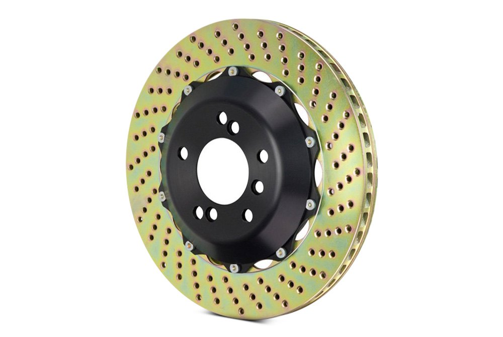 You can see a lot of brake components behind today's open design, large diameter rims, and wouldn't you rather display big drilled and slotted rotors and multi-piston calipers instead of small, plain OE rotors and calipers? Larger diameter performance brake rotors can be heavier than OE components, though. To reduce the weight some have 2-piece construction with the center mounting area made of lightweight aluminum. This weight reduction decreases unspung weight and rotational mass, reducing the load on the suspension and improving handling. Floating rotors are the ultimate 2-piece design. The friction surface can expand independently from the center section, and the rotor is better able to remain parallel to the brake pads and centered within the caliper, for effective braking and long pad life.
