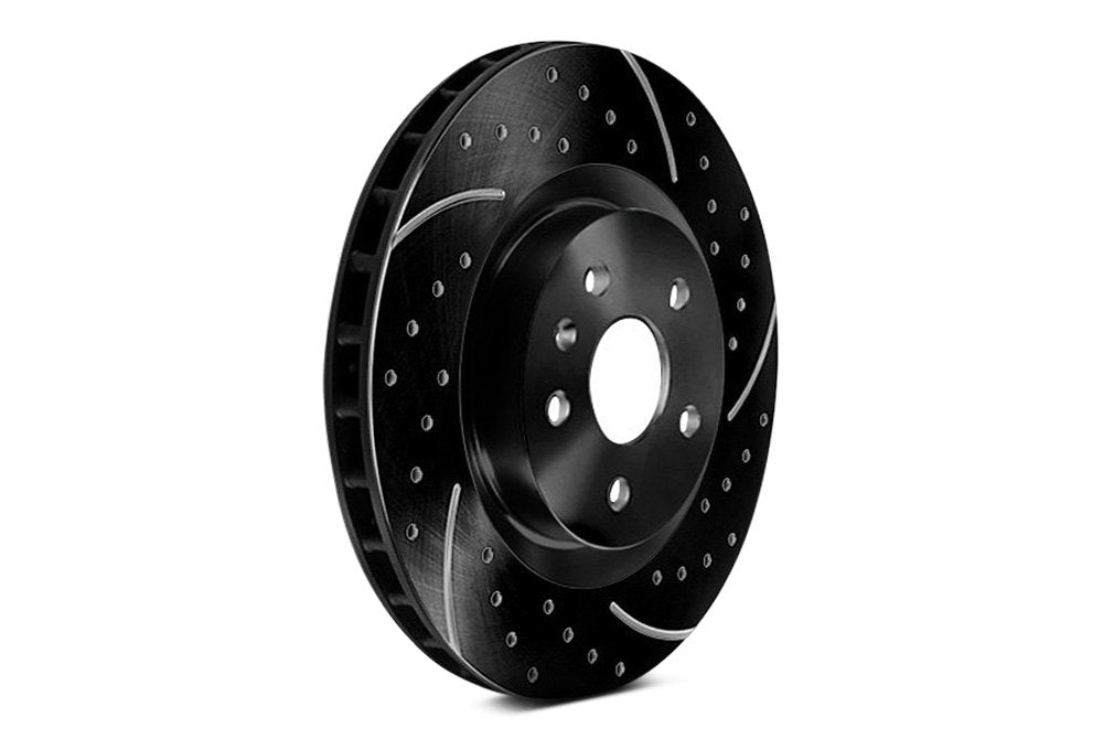 The friction surfaces of performance rotors are drilled or slotted, or have a combination of the two features, to cool the rotor, allow water and pad gasses to escape, and provide better pad contact. Some rotors also have directional cooling vanes to further aid cooling and these are designed to be installed on a specific side of the vehicle. Another way to decrease stopping distance is with larger diameter rotors that can provide greater braking leverage, and the best way to get them is in our big brake kits. These kits also include multi-piston calipers and performance compound brake pads that can supply much greater clamping force. Keep in mind that running bigger rotors, which also positions the caliper further away from the hub, may require mounting larger diameter custom wheels.