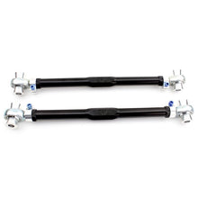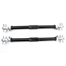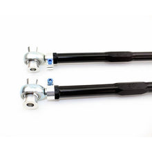 SPL Parts Rear Toe Arms (RTA) for BMW F8X increase stability and response by eliminating bushing deflection while providing an increased range of rear toe adjustment, necessary for lowered cars or for performance alignments. Even small changes to ride height and camber will affect toe settings, and the wide range of adjustment allows you to maximize grip on a track car and extend tire life on a street car. The factory rear toe arms utilize an eccentric bolt and washer for adjustment and lack the precision and range that SPL Parts rear toe links offer. Black Anodized and gun drilled 2024 Aluminum main links along with our 360 degree Rotating Clamp design allow for quick and precise adjustment. The Rotating Clamps are tightened with Blue Anodized Titanium Socket Head Cap Screws for easy to access adjustment, and shaves even more unsprung weight, without compromising strength.