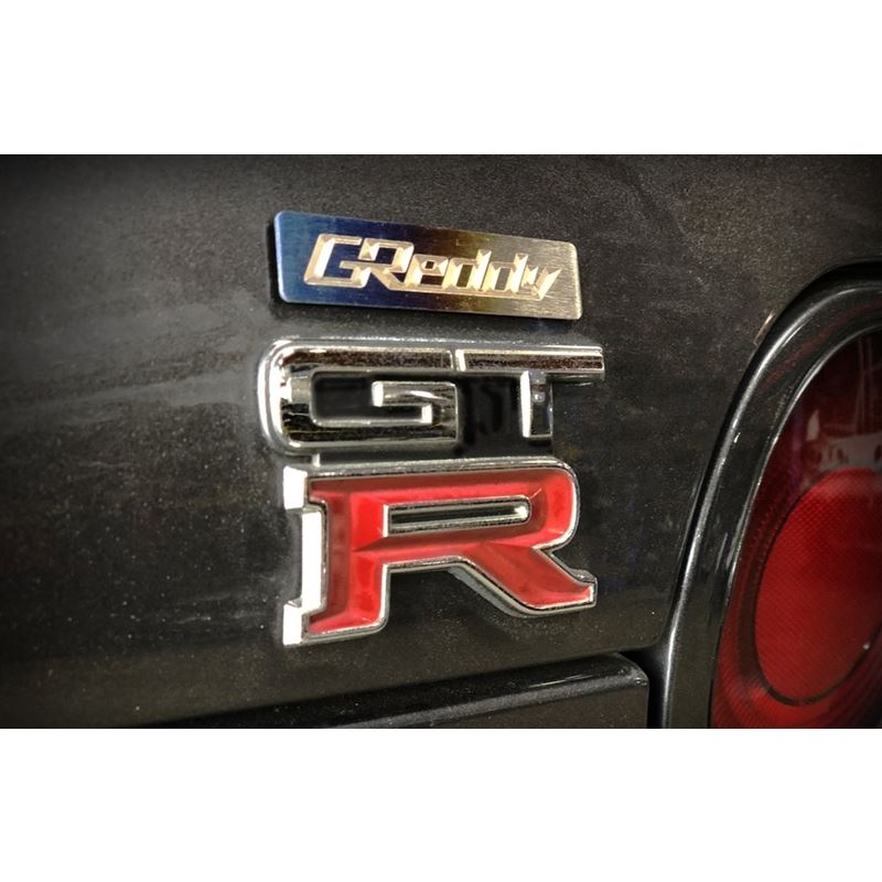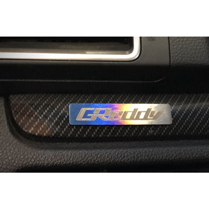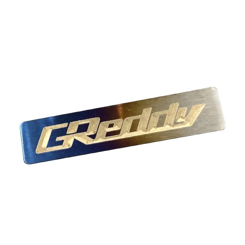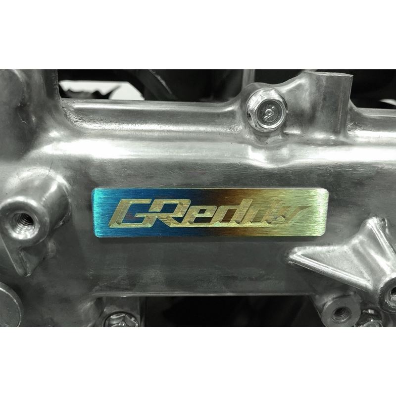 Burnt Ti Titanium GReddy Logo Emblem - Ideal 705mm sized rectangular shape with radiused-corners for installing in interiors and on the exterior. Ultra thin 3M self- adhesive tape back, heat-colored Titanium, with brushed finish. Laser-etched 3D GReddy logo (machined)