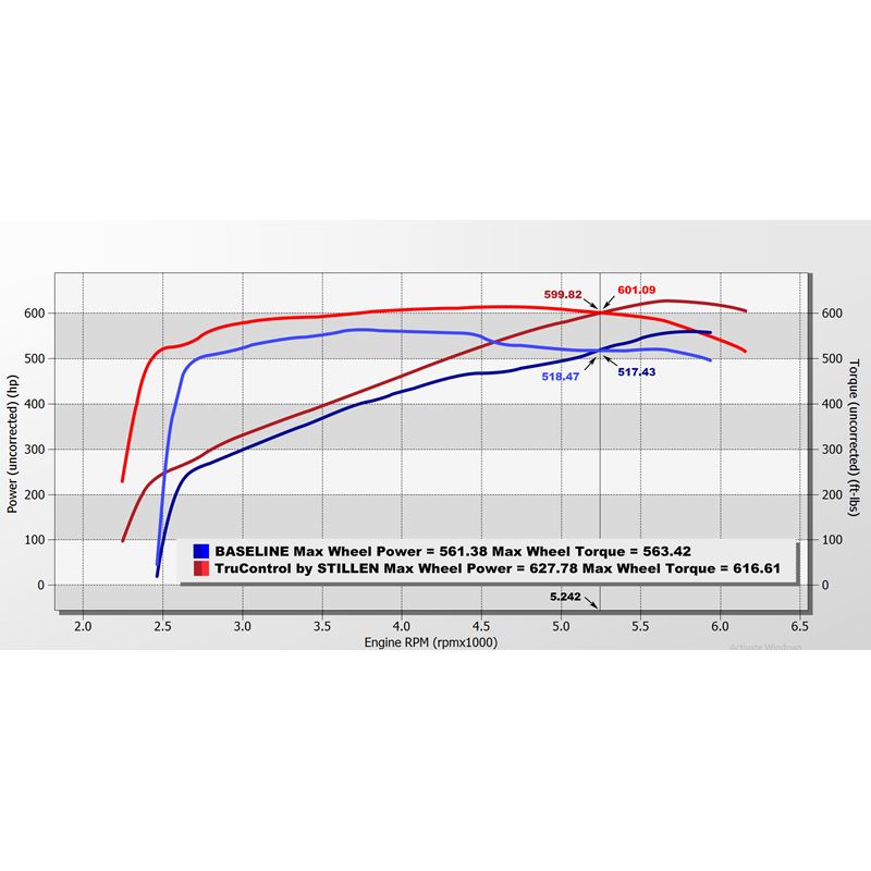 When it comes to increasing the torque output, our TruControl really shines. Maximum torque from the stock dyno was measured at 563 ft lbs at 3750 RPM*. With the TruControl by STILLEN Inline Power Module installed, our test Hellcat put down 616 ft. lbs of torque at 5000 RPM*. Again, we saw the biggest increase over stock near the top end, with increases of 85 ft lbs @4600 RPM measured at the wheels!