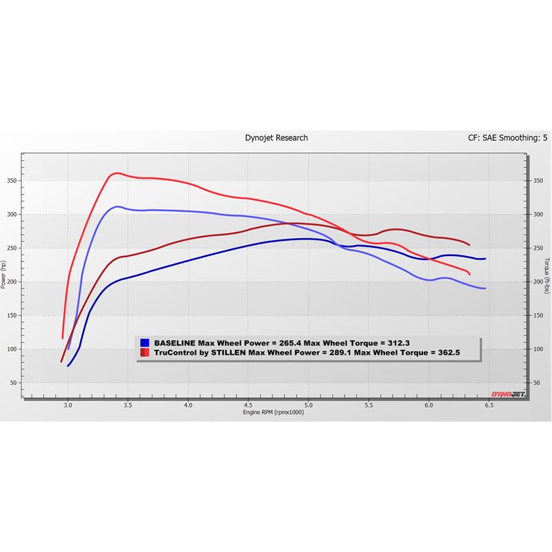 In terms of torque increases, our TruControl truly excels. The stock dyno indicated a maximum torque of 312 ft lbs. Yet, with the TruControl by STILLEN Inline Power Module in place, our test Bronco showcased a remarkable increase, delivering in excess of 362 ft. lbs of torque*. The most significant surge over stock figures occurred towards the lower RPM range, with an additional 50 ft lbs recorded at the wheels!