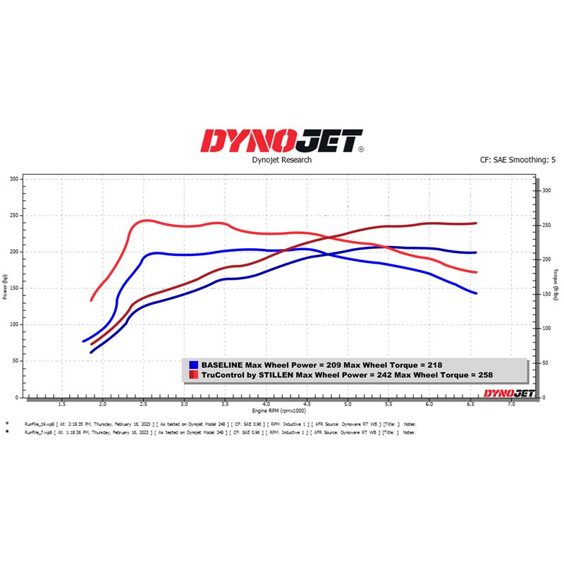 Even greater gains come from the torque output. Maximum torque from the factory was measured at 218 ft lbs of torque*. With the TruControl by STILLEN Inline Power Module installed, our test Elantra's 1.6T put down 258 ft. lbs of torque*. This is an increase of 40 ft. lbs of torque*.