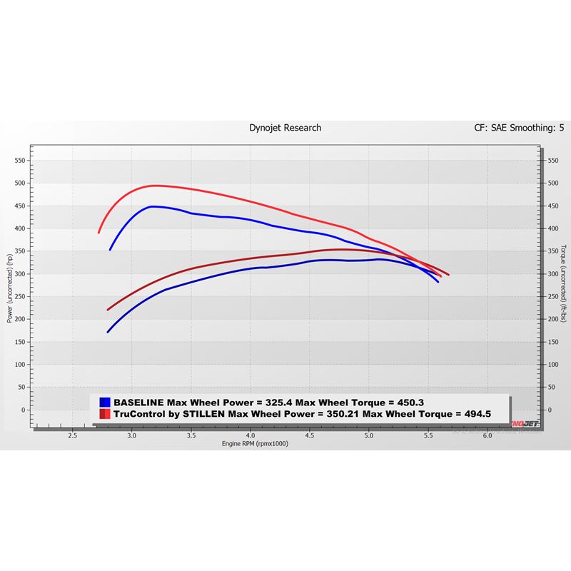 In terms of torque increases, our TruControl truly excels. The stock dyno indicated a maximum torque of 450 ft lbs. Yet, with the TruControl by STILLEN Inline Power Module in place, our test Bronco showcased a remarkable increase, delivering 495 ft. lbs of torque*. The most significant surge over stock figures occurred towards the lower RPM range, with an additional 45 ft lbs recorded at the wheels and over 500 ft lbs at the flywheel!