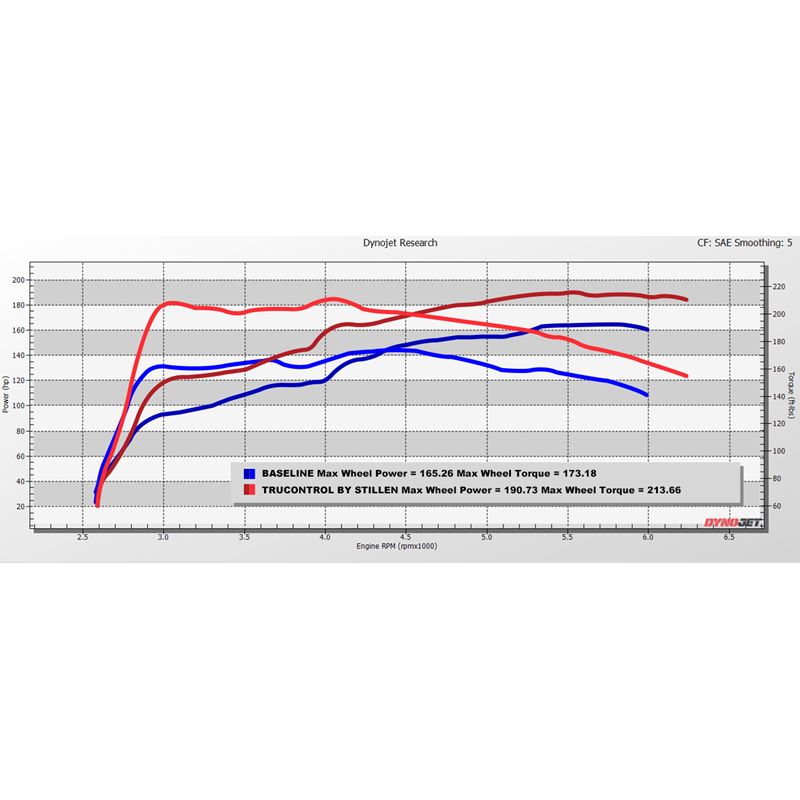 From the factory the Honda Accord is rated at 192 flywheel horsepower. In it's stock condition, we recorded a maximum wheel horsepower of 165. After installing our TruControl by STILLEN Inline Power Module the dyno reported back a maximum wheel numbers of 190 horsepower(+25 whp) and torque exceeding 213 foot pounds, up almost exactly 40 foot pounds at the wheel from the stock 173 foot pounds. Making the wheel horsepower match the factory flywheel horsepower*.