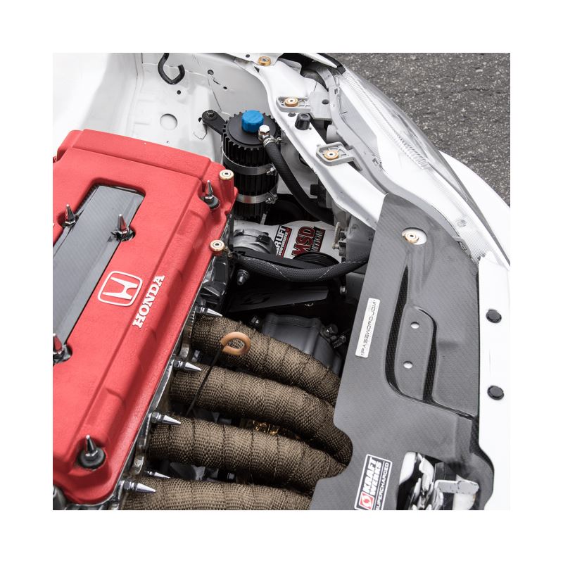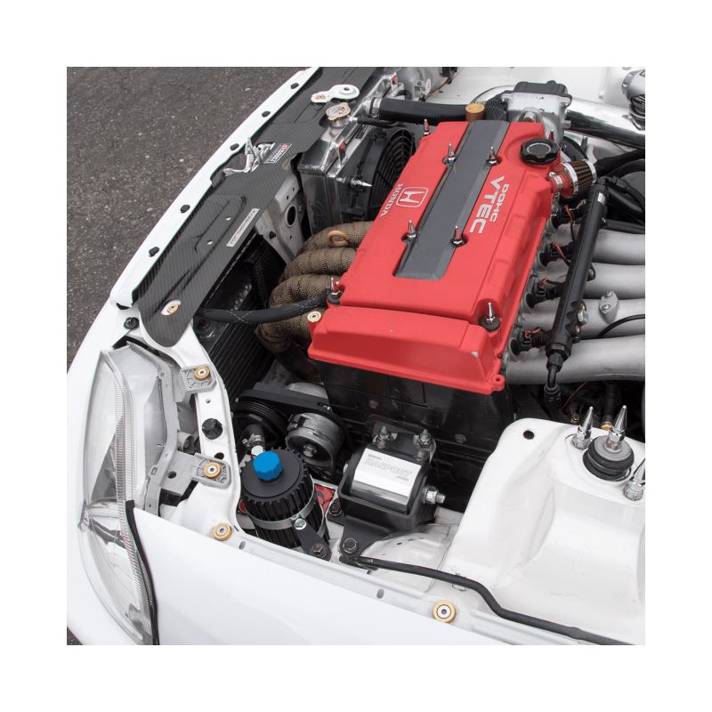The B-Series Race Kit is based off of the impressive Rotrex C30-94 supercharger. The B-Series Race Kit produces impressive results throughout the entire power band due to its patented traction drive technology. And, unlike any other forced induction system, this kit provides a linear power curve, torque on demand, cooler operating temperatures. The B-Series Race Kit provides instant throttle response and a progressive power curve that increases all the way to redline without the typical 'spiking' or 'surging' associated with turbochargers. This unique, more useable power curve results in reduced cylinder pressures, less strain on engine components, and increased reliability. Rotrex superchargers also operate much cooler when compared to turbochargers and other supercharger systems, which reduces the engine's intake air temperature as well as its risk of detonation. Rotrex superchargers are renowned for their compact size, high adiabatic efficiency, low vibration, and quiet operation. Their unique traction drive technology is what makes all of this possible, which, unlike other superchargers, transmits power through frictional forces between its rolling elements. Each Rotrex unit features its own self-contained oiling system that remains independent of the engine. Its dual-action oil pump supplies traction fluid to the supercharger while the supplied cooler ensures proper fluid temperatures at all times. Kraftwerks has designed the billet aluminum brackets to mount the C30 line of changers. The bracketry is designed to mount the head unit low on the motor in a similar position to that of the OEM A/C compressor. The kit requires the installer to fabricate the supercharger inlet pipe, charge pipes, and intercooler as well as provide all necessary support parts and tuning. Fits B16A, B17A, B18A, B18B, B18C, B20A, and B20Z