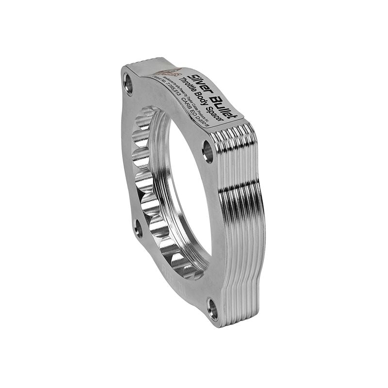 The Silver Bullet is machined from T-6061 billet aluminum for long lasting performance and durability. And the serrations at the spacer entrance reduce the annoying whistling at idle and cruising speed that is characteristic of other throttle body spacers.