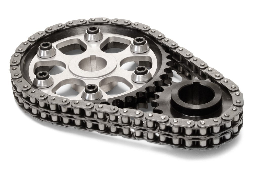 We offer quality roller timing sets with various means to adjust cam timing. Some have a choice of keyways in the crank sprocket, while others have offset bushings or slots for cam sprocket adjustment. This not only enables you to set the cam to the manufacturer's specs, but you can advance or retard cam timing to suit where you want to make power. In general, advancing the cam opens the intake valve sooner for more low-end torque, and retarding it closes the intake valve later for more high RPM power. We also have quick access timing cover setups to make adjustment easy.