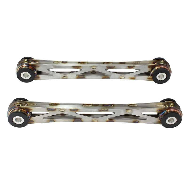 PFADT Series Rear Tie Rods Set by aFe. aFe Control is proud to release the PFADT Series, Fabricated Trailing Arms. By using the latest FEA analysis software, our engineers were able to increase strength by 106% while simultaneously reducing mass by 17%. This decrease in mass allows the suspension to react quicker to changing road surfaces and keeping the tire in contact with the road, thus increasing traction. This design also achieved a 32% reduction in deflection, resulting in decreased wheel hop, increasing traction even further. The trailing arms are made in the USA and feature laser cut, 14 gauge 304 Stainless Steel plate, TIG welded in a I-Beam configuration for added strength and rigidity. The kit includes, lightweight, hard anodized 6061-T6 aluminum sleeves, specially grooved, graphite impregnated bushings and zerk fittings for a quiet, comfortable ride suitable for street or track use. Designed as a direct fit application with no vehicle modifications necessary, bolt a set on today and regain traction and confidence in your car.