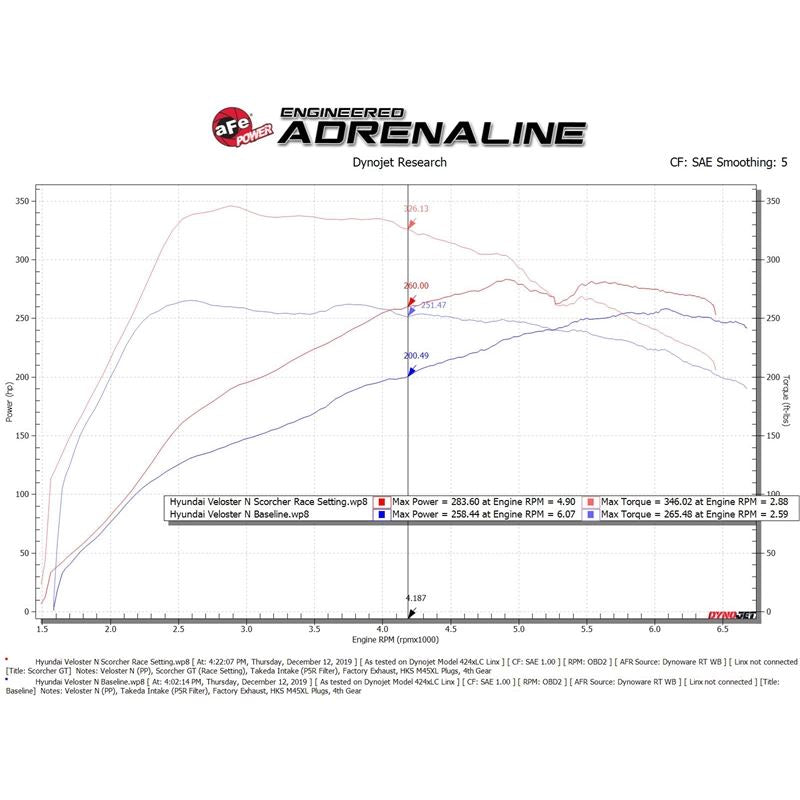 aFe POWER strongly recommends upgrading the factory spark plugs to high performance spark plugs to maintain a stronger, more consistent spark and prevent any damage to your engine. During our testing we used HKS M45XL spark plugs and recommend those spark plugs or equivalent. Alternatively, the factory spark plug gap can be closed to 0.026" or smaller. The use of 91 or higher octane is also highly recommended.