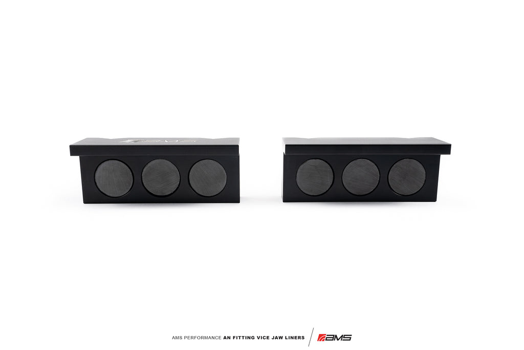 Stop damaging your aluminum AN fittings with the improper tools, and pick up a set of AMS Performance AN Fitting Vice Jaw Liners. Allowing for non-marring AN line assembly, the AMS Vice Jaw Liners attach with ease to most standard bench vice with their built-in magnetic inserts. These CNC machined billet aluminum inserts are the perfect addition to your workbench.