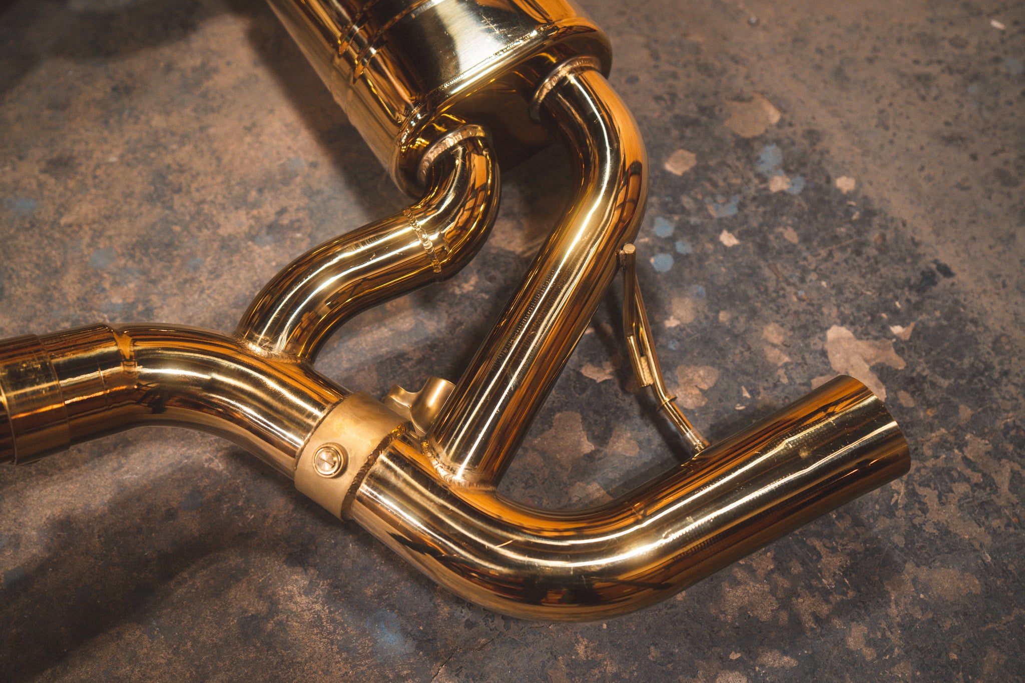 Welcome to a sound revelation for the AMG GTs' M178 dry sump V8. This system the latest technologies to give the 4.0L TwinTurbo V8 the best sound characteristic possible. Constructed of Anodized Gold T304 stainless steel or our signature titanium, this full exhaust system gives your AMG GT the most aggressive sound experience. The system runs 3 inches all the way back to the OEM tips.