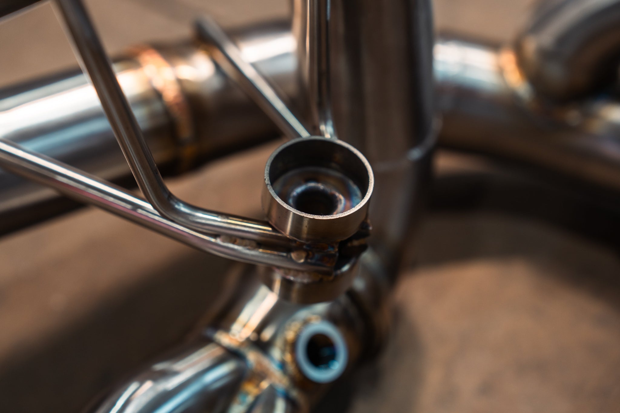 This system is truly unparalleled in sound quality. In the quest for the most incredible, highest pitched, and most enjoyable sound characteristic possible, our last year and a half of research and development has led us to a sound experience that must be heard in person to be believed. For the 991 generation of the GT3 The DFI engine was chosen in favor of the Mezger and many people were afraid that it would lose its classic sound characteristics, but Porsche delivered, as always, with a 9000 RPM 3.8 and 4 L flat-six that had an incredible sound symphony from the factory. As we know, factory sound though leaves a lot to be desired in regards to rawness and that elusive F1 Experience. We have designed the system to run 2.5 inches all the way back and to utilize our large stamped cross-section X pipe to engage that F1 sound, and the added loop sections to increase the length of the exhaust and to accentuate the F1 sound. Combine with a set of three flow headers this is as good as cars get.